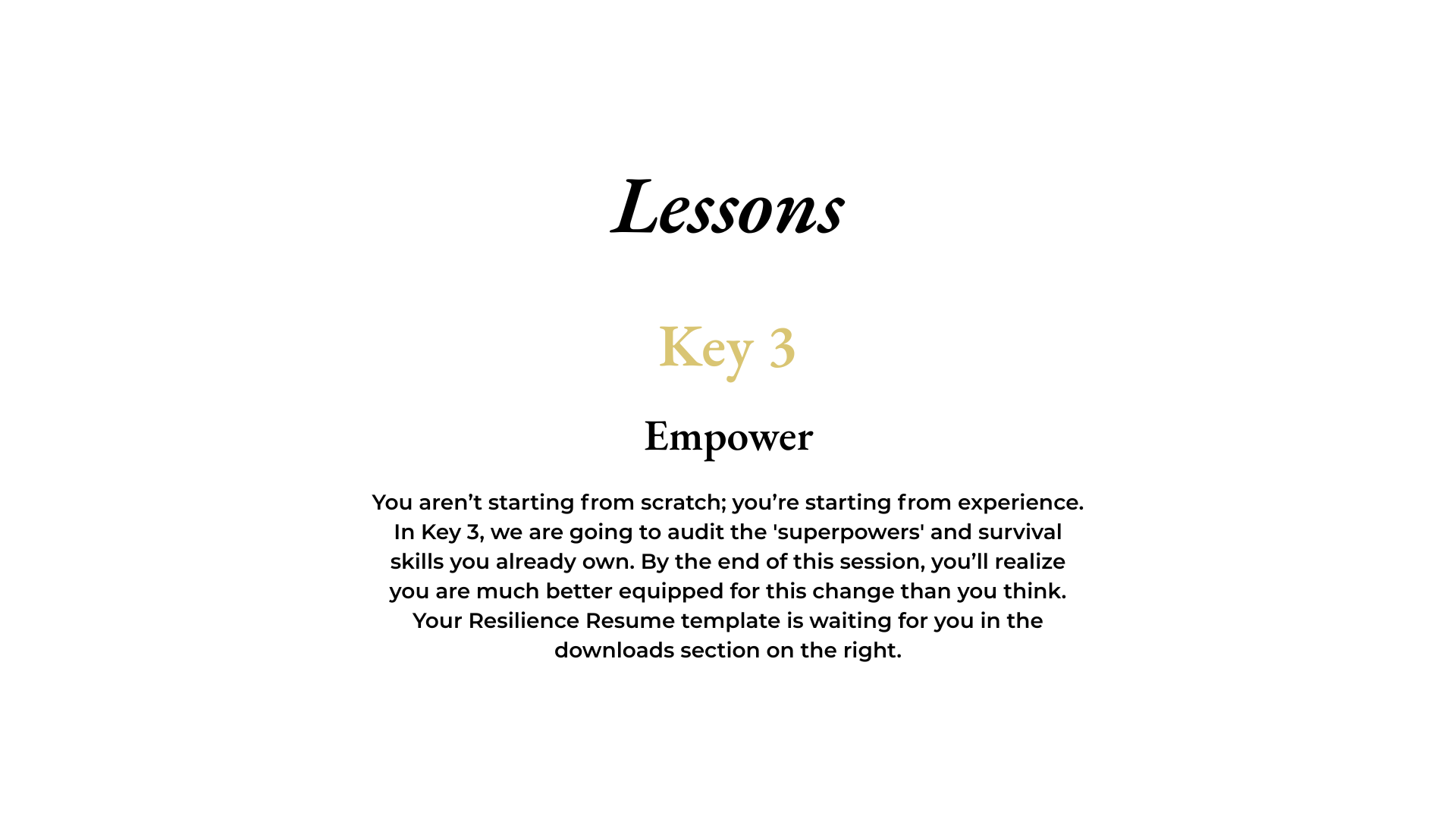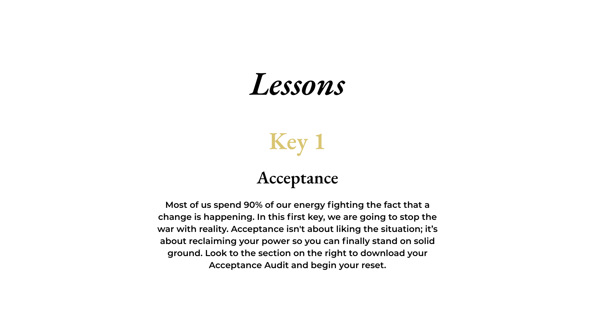 The course is designed to be completed in a single, focused day—requiring approximately 60 to 90 minutes of your time, or as much as you’d like to lean in. You will receive four targeted video lessons, each outlining a specific Key and its supporting activities.