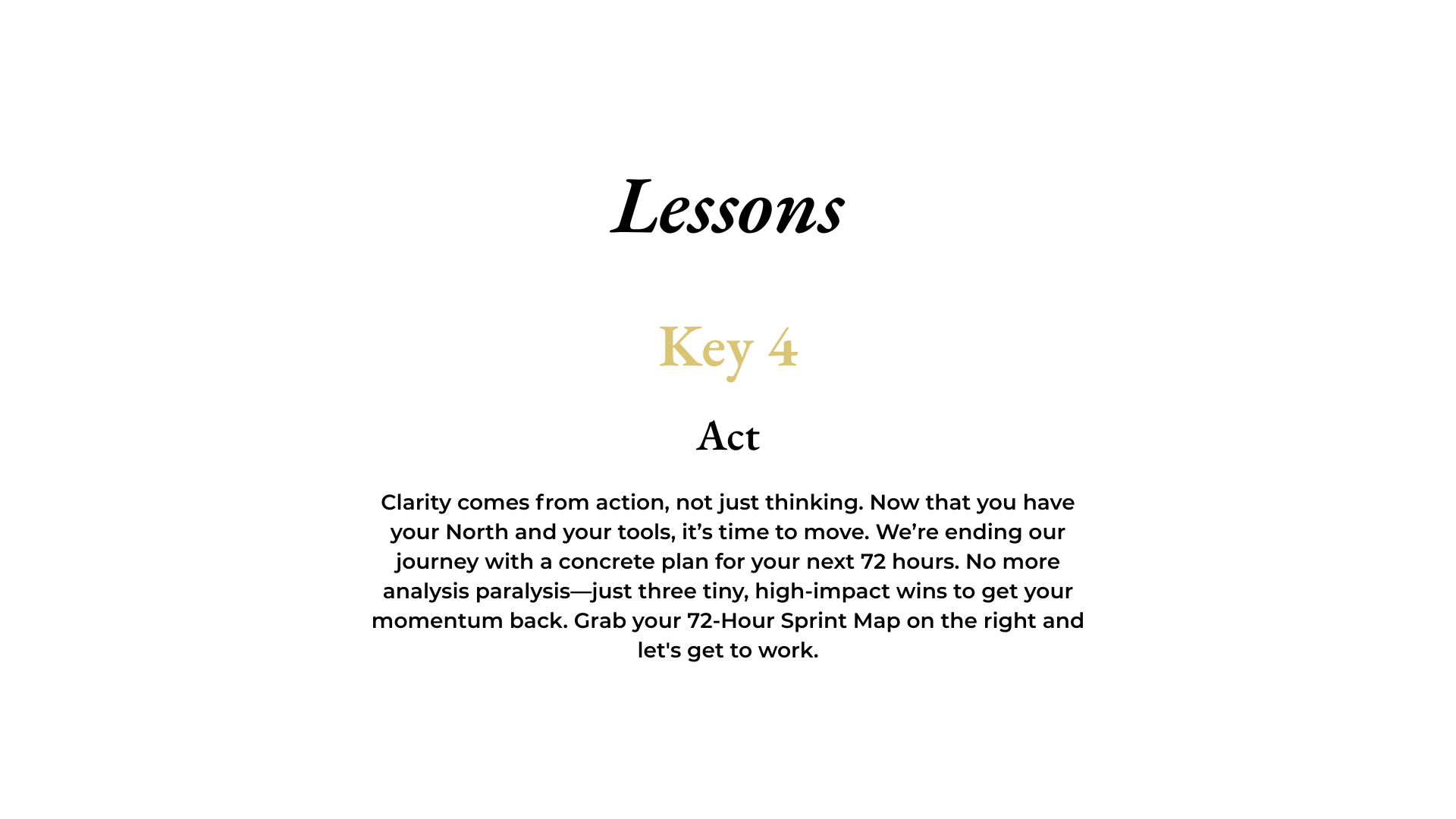 3. Immediate Momentum: By the end of your day, you will have moved through the fog and into a clear, committed plan for your next 72 hours.