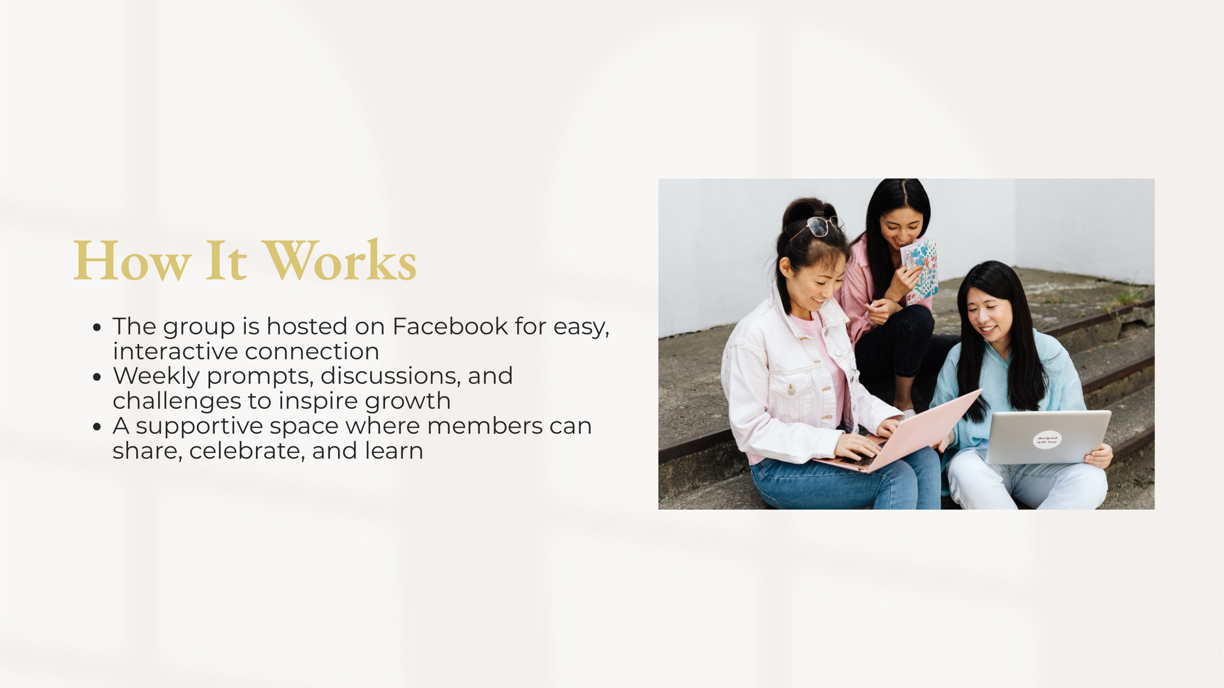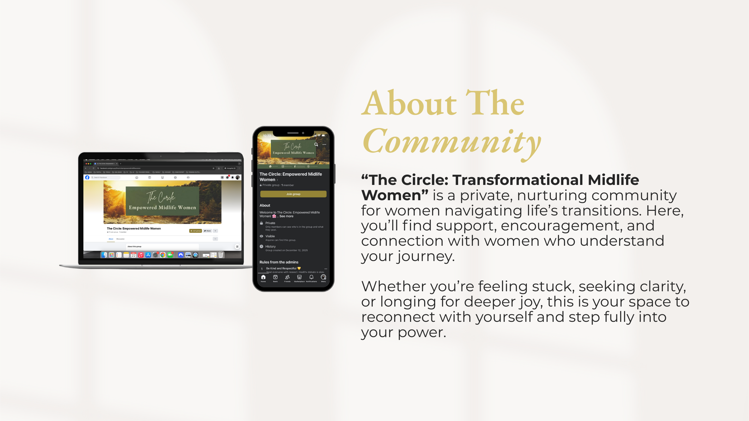 A safe, supportive space for midlife women to reconnect, rediscover joy, and create the life they truly desire—together.